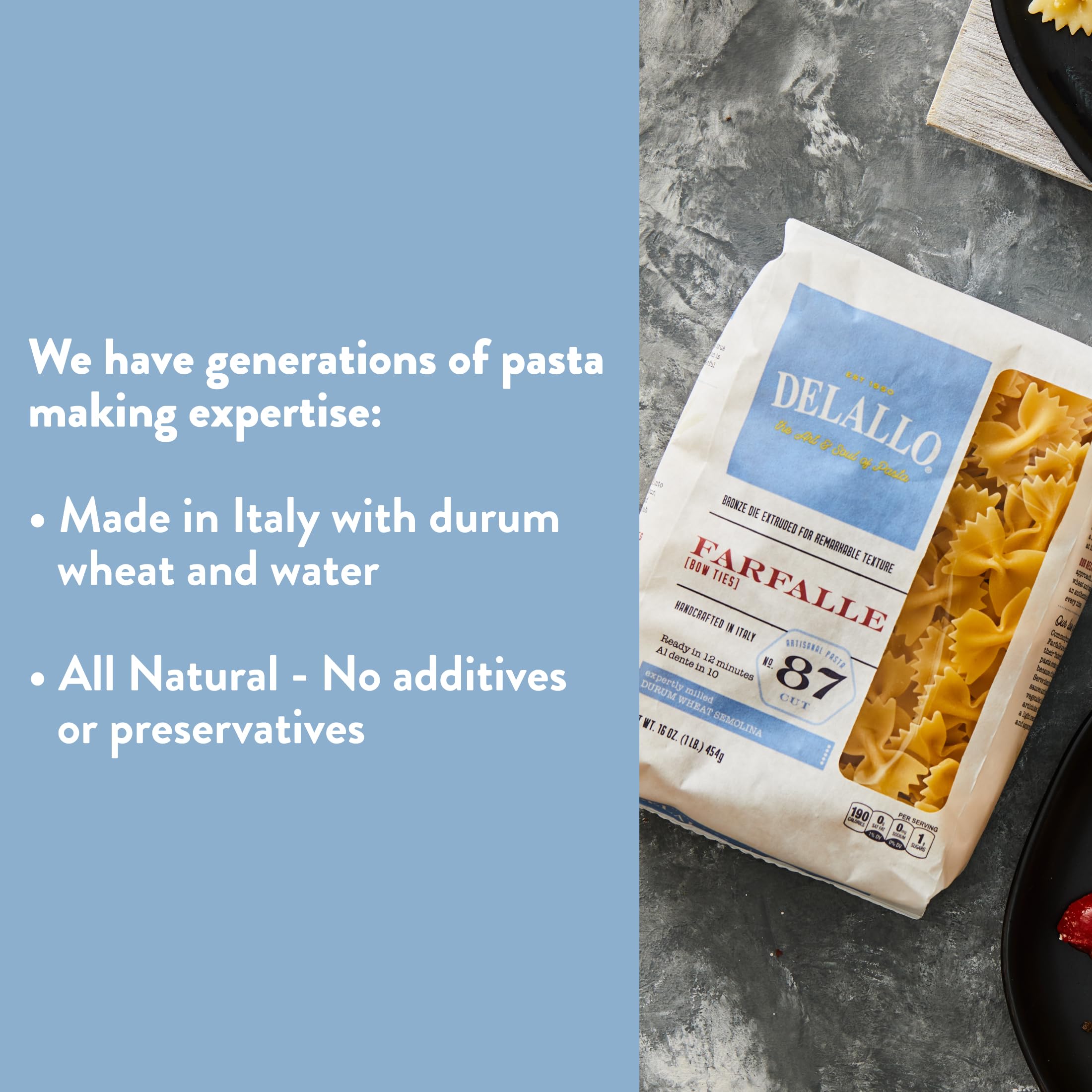- MADE IN ITALY: DeLallo Semolina Pasta begins with a high-quality durum wheat. The wheat is chosen for its beautiful color, wonderful aroma and high protein content