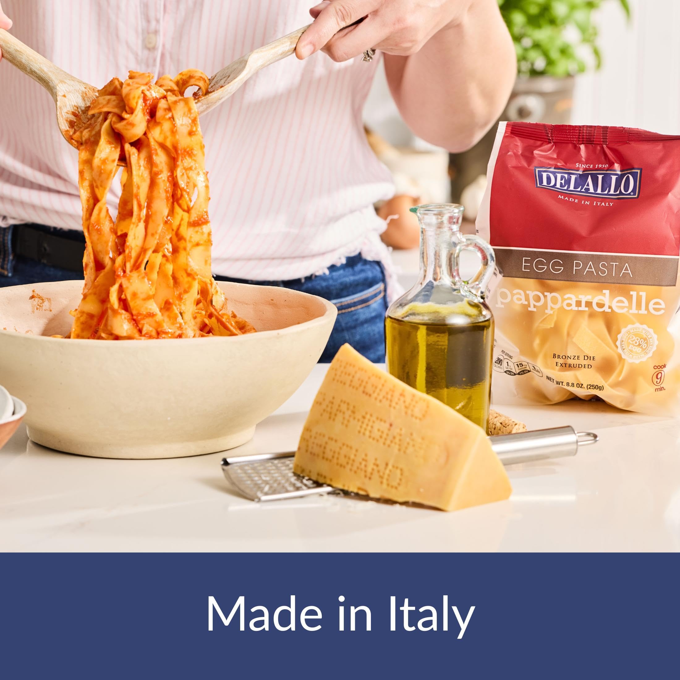 - DeLallo Pappardelle is made in Italy with high-quality durum wheat, then kneaded with spring water and 28% farm fresh eggs.